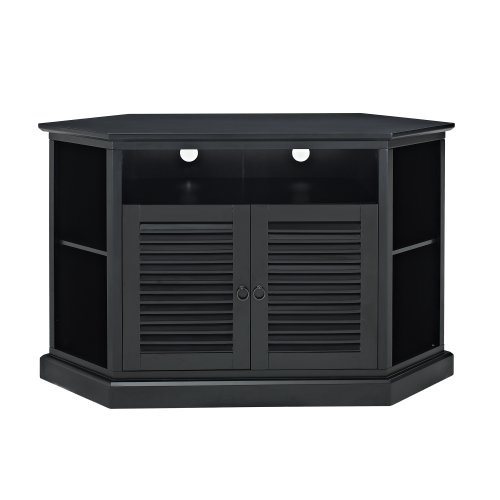 Assembly instructions included with toll-free number and online support Ships ready-to-assemble with necessary hardware and tools Features adjustable shelving and louvered doors High-grade mdf construction in rich, painted black finish Corner tv stand accommodates most flat-panel tvs up to 55-inch
